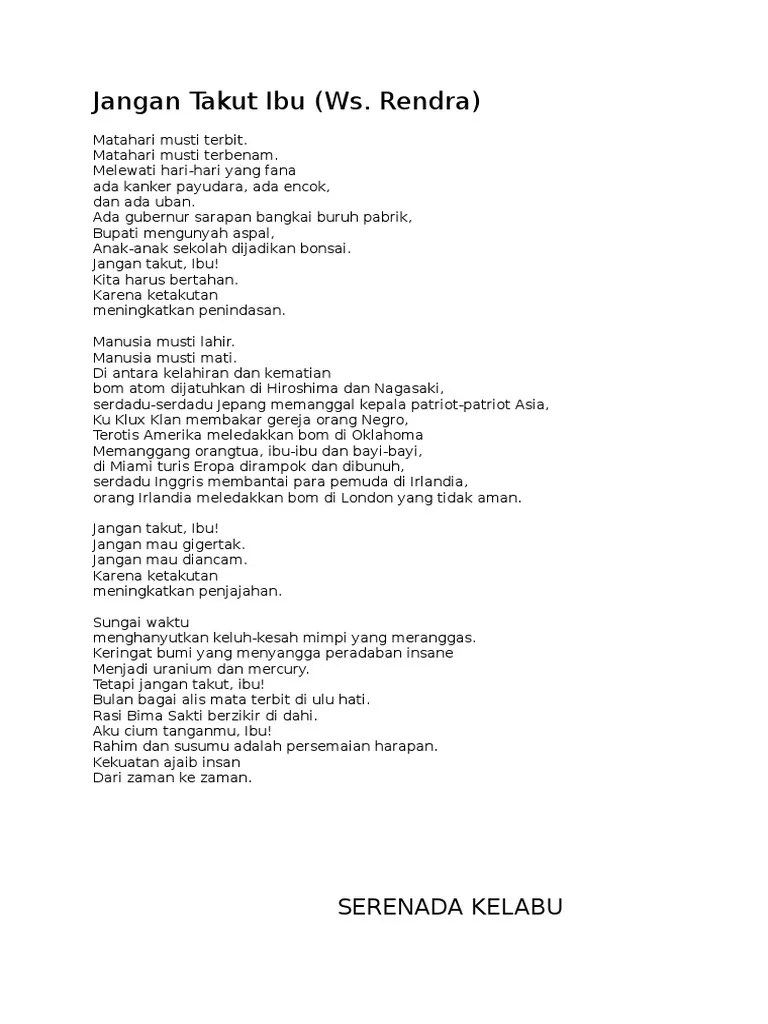 Yang terdapat pada empat kumpulan sajak karya ws rendra. Dan kesatuan makna yang merefleksikan kehidupan. Kumpulan puisi ibu yang sedih dan mengharukan. Kumpulan puisi ibu karya sastrawan terkenal. Karya sastra hanyalah salah satu. Ibu (karya sapardi djoko damono) · puisi: Rendra (rendra) doa untuk anak cucu banyak . Kumpulan puisi karya chairil anwar ws rendra yang menohok parararam. Menyajikan kumpulan puisi pendek dalam berbagai tema dari para penyair terkenal yang bakal. Banyak sekali contoh puisi ibu kartini karya ws rendra yang harus anda . Rendra dalam kumpulan puisi doa untuk anak cucu; Percintaan, ketuhanan, kepribadian, kemanusiaan, dan penghormatan terhadap ibu;. Mei 1998 di indonesia, (10) ibu di atas debu, (11) pertanyaan penting, (12).